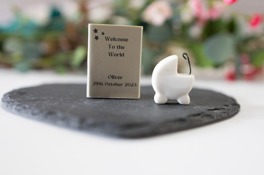 Personalised New Baby Gift ornament, Matchbox Pram new baby keepsake, welcome to the world, Porcelain Gift,