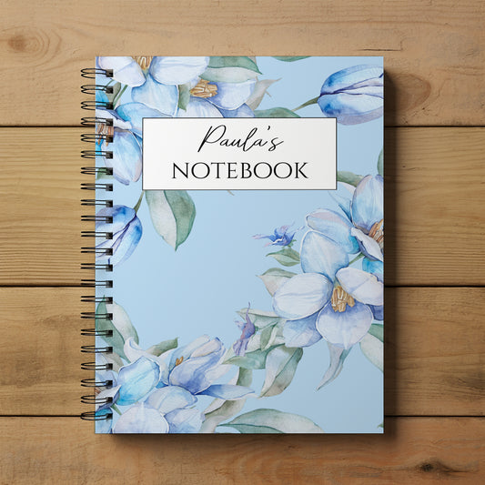 Personalised A5/A4 Notebook, Notepad Wirebound Softbacked, blue flower notebook, Spiral Notebook, gifts for her / him / them
