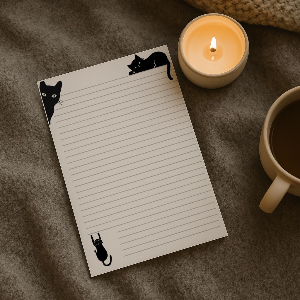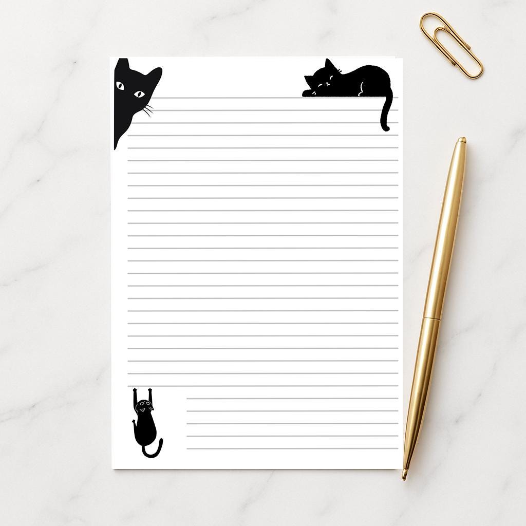 Cute black cat writing paper with lined pages. Available in A4 or A5, printed on 100gsm FSC approved paper. Perfect for letters, journaling, note-taking, or personal stationery. Eco-friendly, high quality, and ideal as a thoughtful gift for writers and stationery lovers.